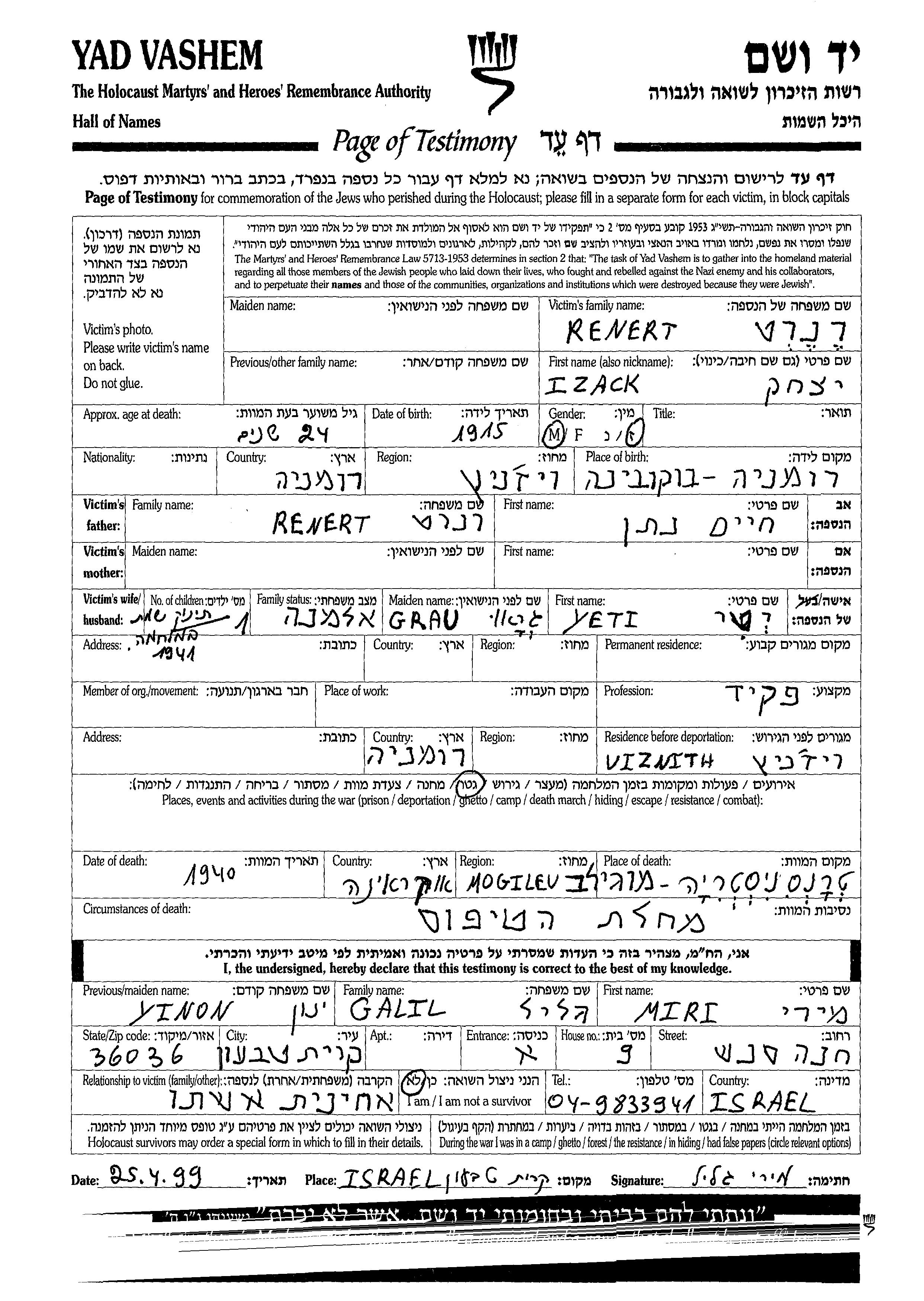 Изак Ренерт, место рождения: Визниц, Румыния. Отец: Хаим Натан. Клерк. Женат / замужем. Место во время войны: Визниц, Румыния.