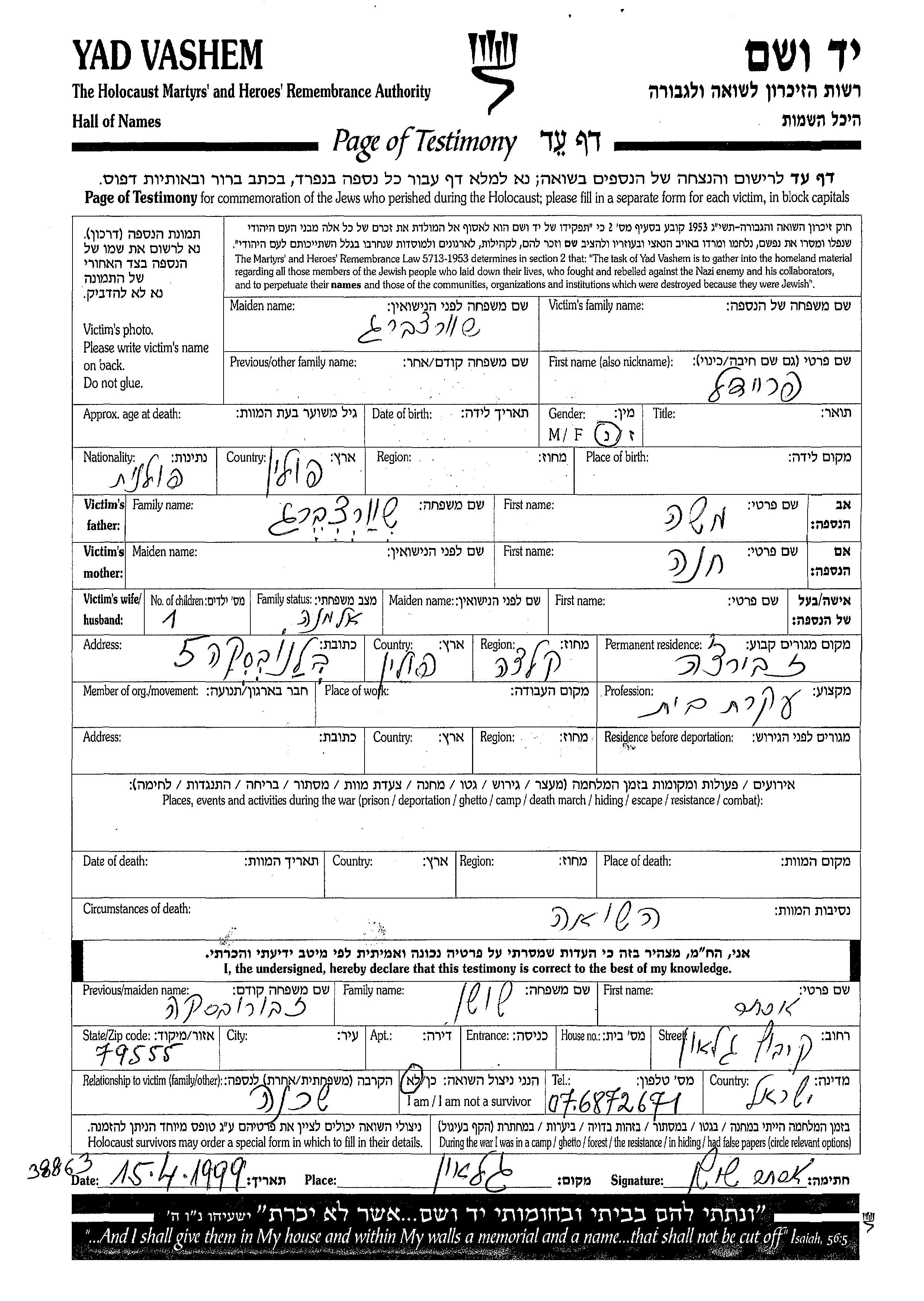 Яд Вашем - Листы свидетельских показаний Мемориального фонда