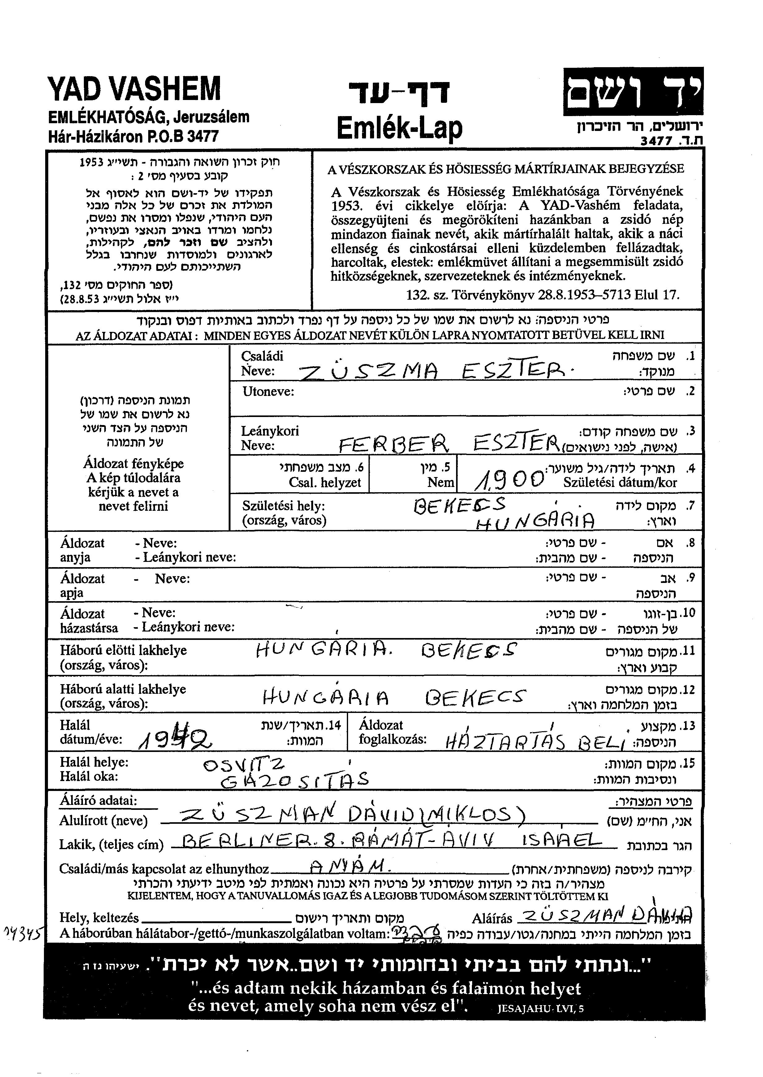 Эстер Зусман, девичья фамилия Фербер, место рождения: Бекеч, Венгрия. Домохозяйка. Место жительства до войны: Бекеч, Венгрия. Место во время войны: Бекеч, Венгрия.
