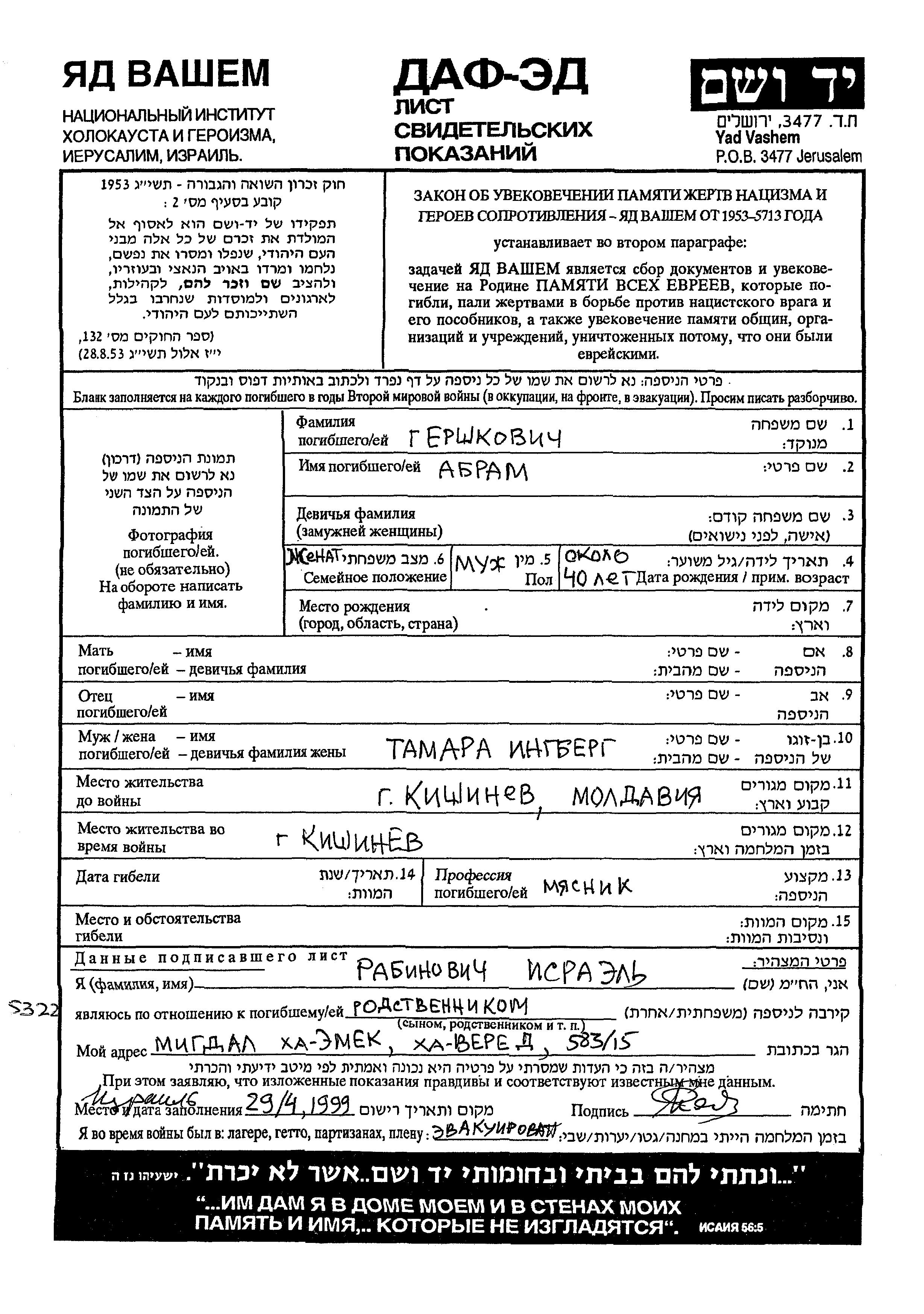 Гершкович Абрам Кишинёв, Румыния Лист свидетельских показаний