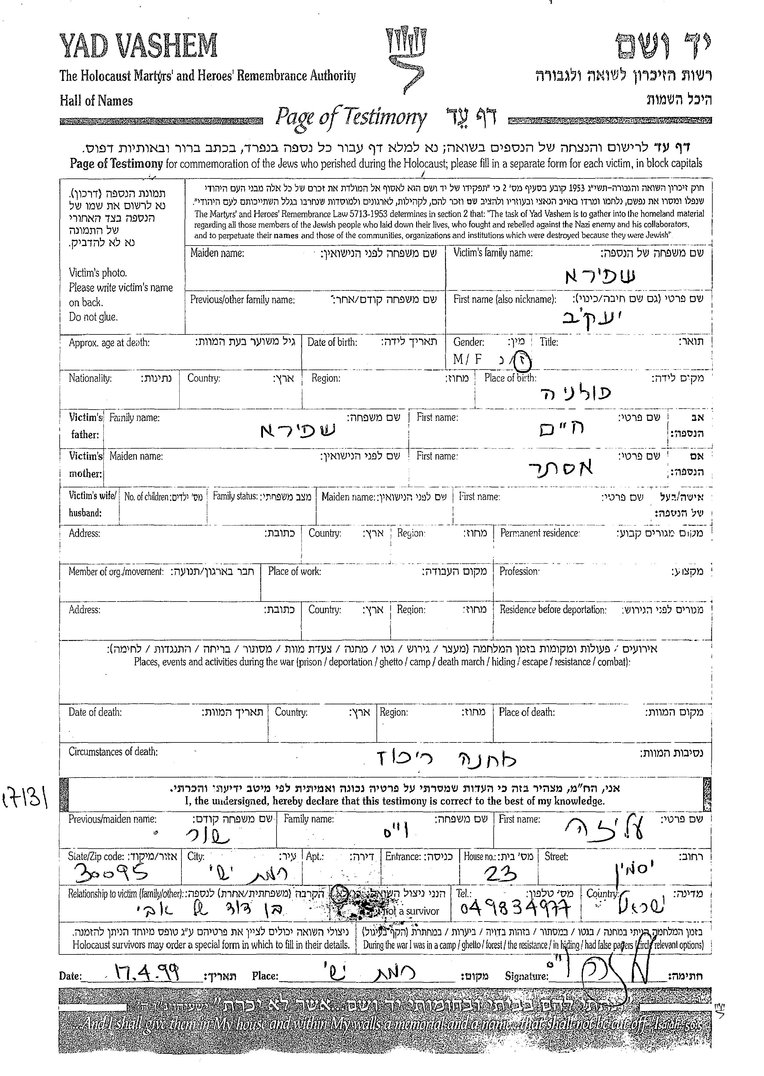 Яд Вашем - Листы свидетельских показаний Мемориального фонда