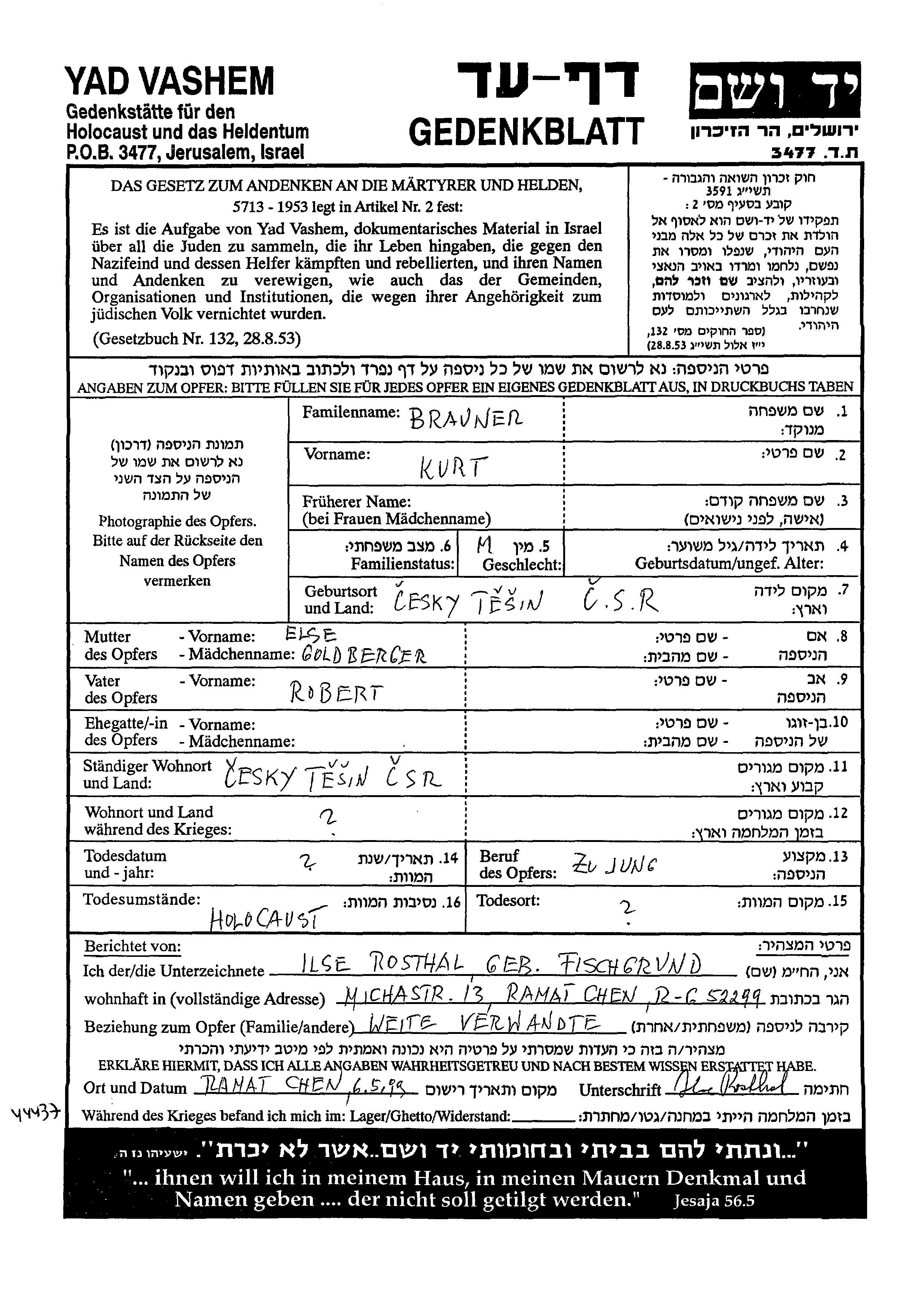 Курт Браунер, место рождения: Чески Тешин, Чехословакия. Отец: Роберт, mать:Эльзе. Место жительства до войны: Чески Тешин, Чехословакия.