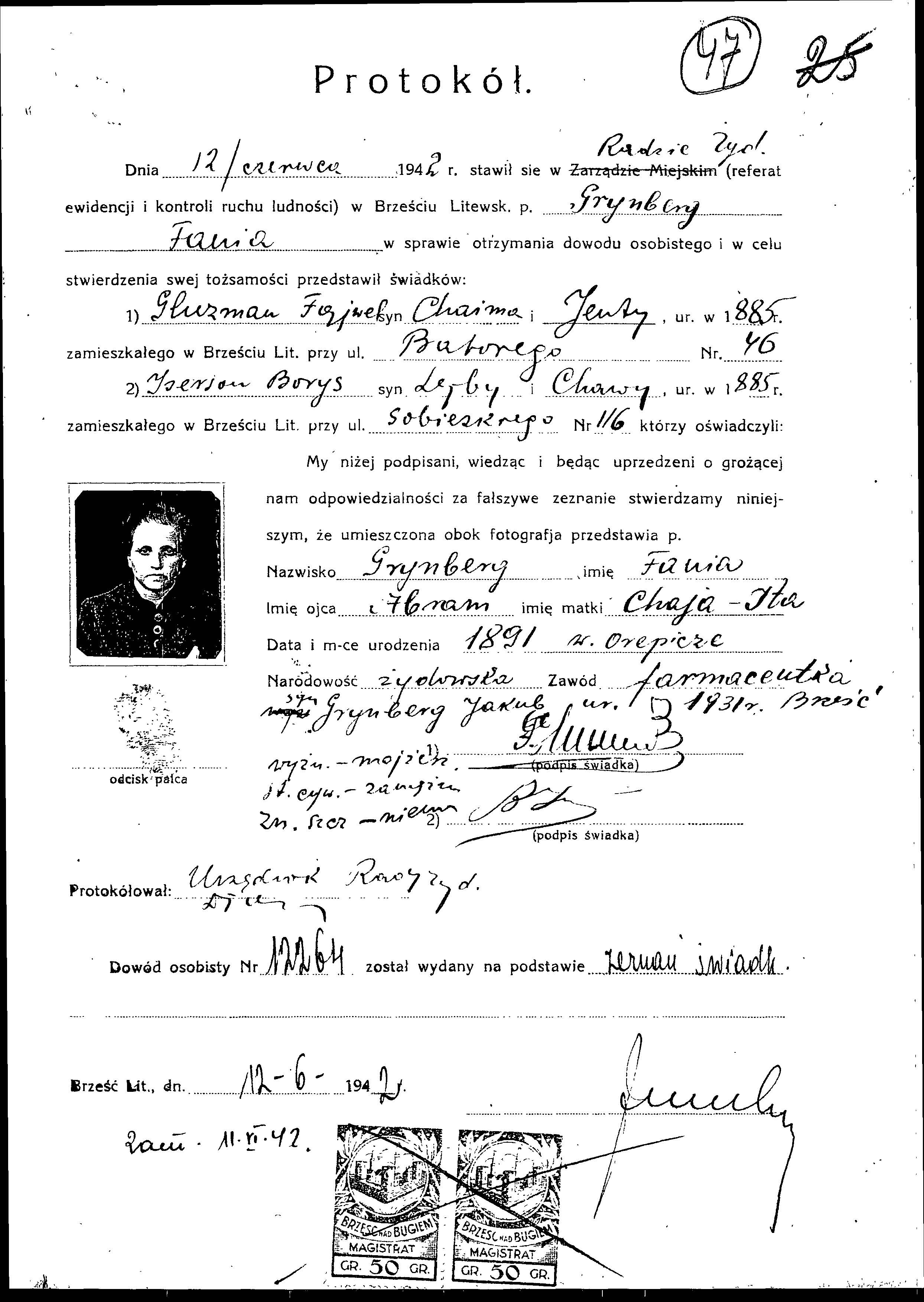 Фаня Гринберг, девичья фамилия Якубовски, место рождения: Российская Империя. Врач. Место жительства до войны: Брест, Польша.